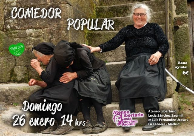 Comedor Popular en el Ateneo Libertario Lucía Sánchez Saornil, este domingo 26 de enero a partir de las 14 horas.